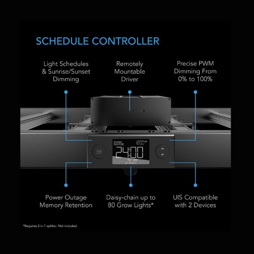 The included schedule controller can automatically adjust light based on the time of day. It features 10 light intensity levels and a scheduling mode that will cyclically activate this grow light. Customize this daily cycling with an innovative sunrise and sunset setting that gradually brightens and dims the lighting to accurately replicate the sun's movement. Use this grow light with an advance UIS controller like CONTROLLER 69 PRO to fully automate it by integrating it into the UIS platform. This will enable further access to remote control over WiFi and advance programming like automation and grow recipes when connecting to the AC Infinity app.