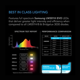 Features Samsung LM301H EVO LEDs each rated at 3.14 µmol/J PPE, the highest efficiency of LM301B, LM301H, and Bridgelux 3030 chips.