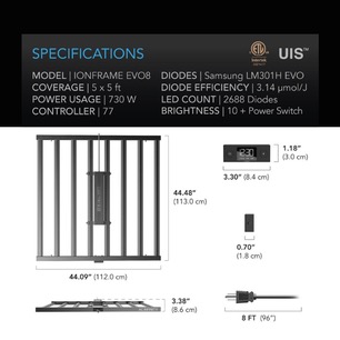 Each IONFRAME light features genuine Samsung LM301H EVO diodes, the latest in horticulture lighting technology that emits intense brightness at greater efficiency. This performance is superior to leading Samsung LM301H and LM301B LEDs, as well as Bridgelux 3030, and other previous-generation LEDs. EVO diodes help improve plant growth by emitting greater light quality and more light output per diode, with a higher blue spectrum and greater efficiency when compared to non-EVO diodes. The IONFRAME EVO is supported by an array of (8) 395 nm UV diodes, (88) 660 nm OSRAM red diodes, and (8) 730 nm OSRAM far-red diodes to complete its full spectrum light output.